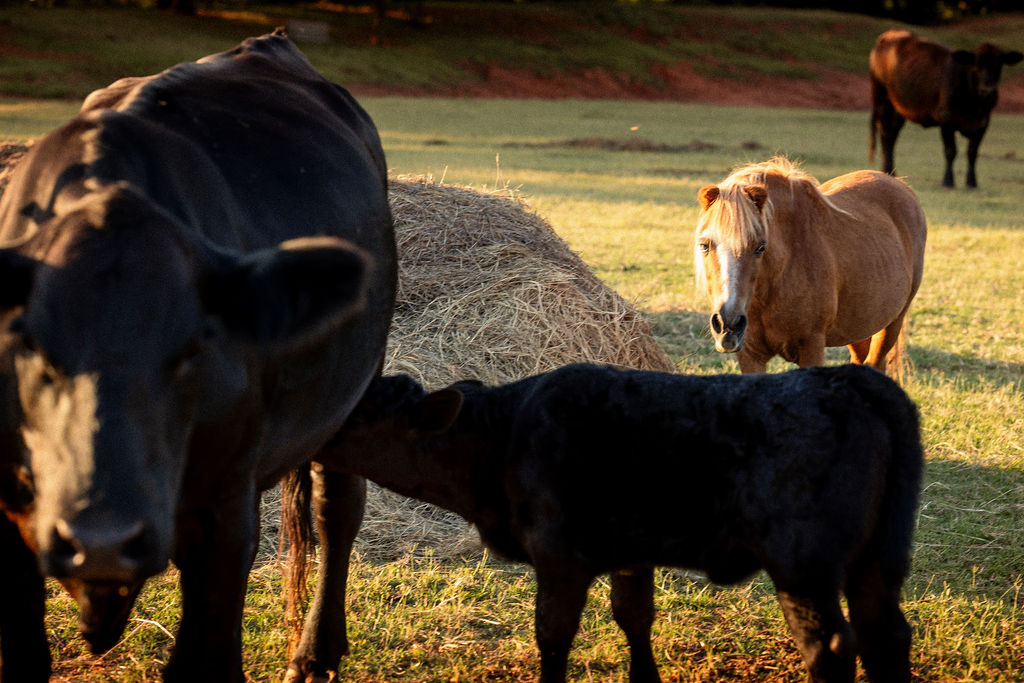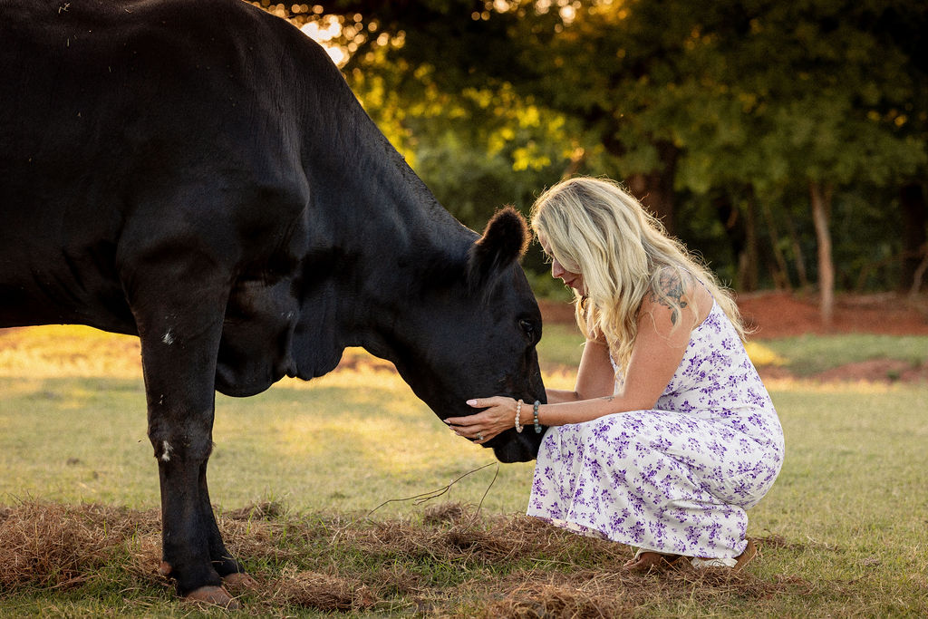 After the chickens, we moved into the pasture where Danielle introduced me to her cows and donkey. Just four days before I arrived, one of her cows had given birth to a calf. I was secretly hoping the baby would let me get close enough to capture some intimate photos, but like most newborns, she was skittish and quick to run away before I could get within reach. Mama cow, however, was more than happy to take part in the shoot. She was curious, affectionate, and seemed to show us around her home as though she knew exactly what we were there for.