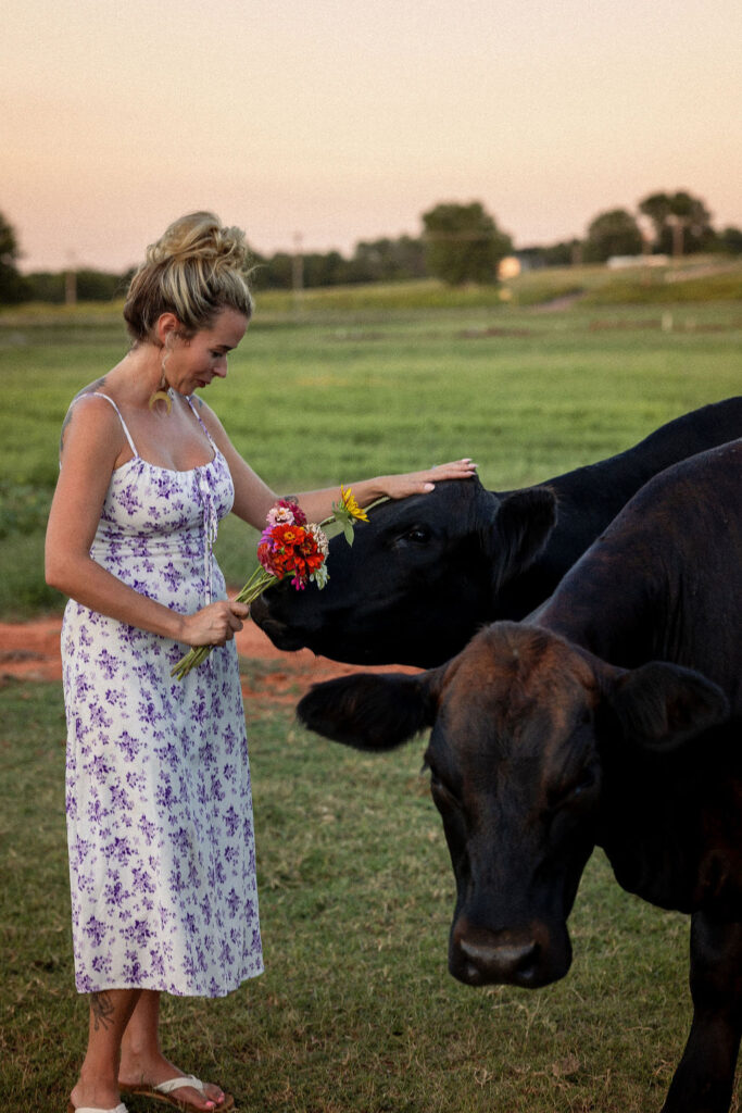 As we picked flowers and vegetables, the sun began to set in the distance. Of course, Mama cow couldn’t resist sneaking a bite of the flowers we gathered, but we laughed and let it be part of the story. It was the perfect representation of how unscripted moments create the most meaningful images.