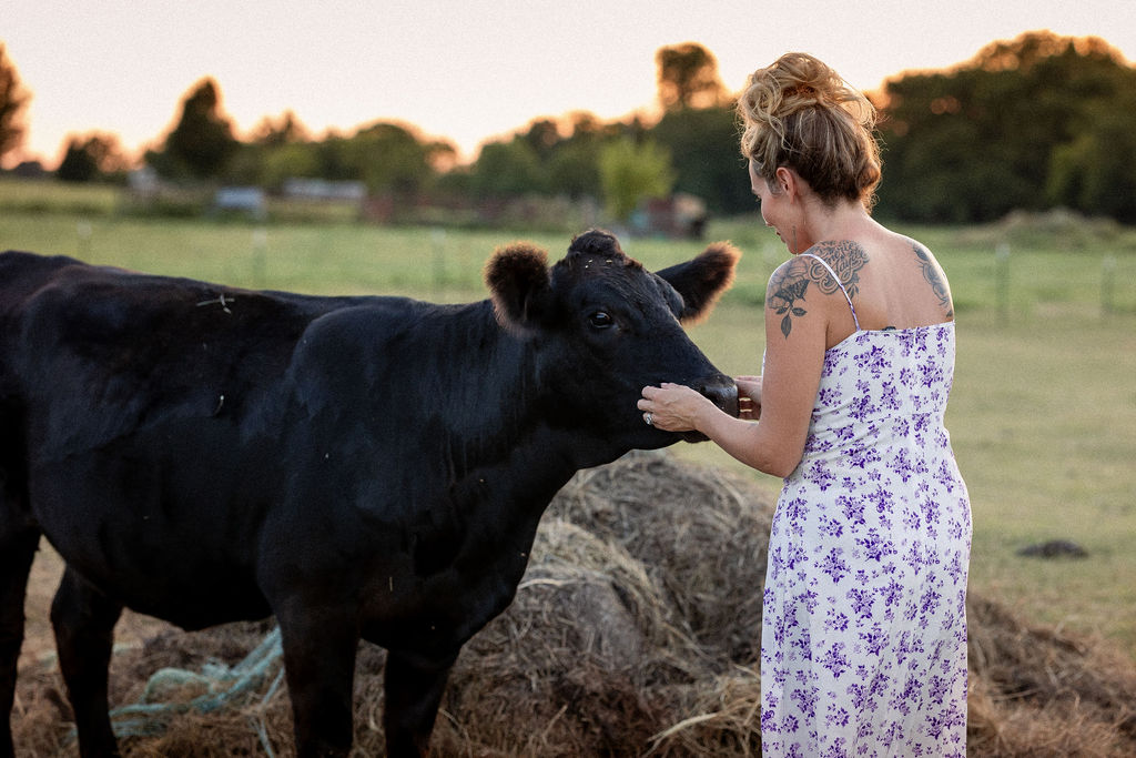 After the chickens, we moved into the pasture where Danielle introduced me to her cows and donkey. Just four days before I arrived, one of her cows had given birth to a calf. I was secretly hoping the baby would let me get close enough to capture some intimate photos, but like most newborns, she was skittish and quick to run away before I could get within reach. Mama cow, however, was more than happy to take part in the shoot. She was curious, affectionate, and seemed to show us around her home as though she knew exactly what we were there for.
