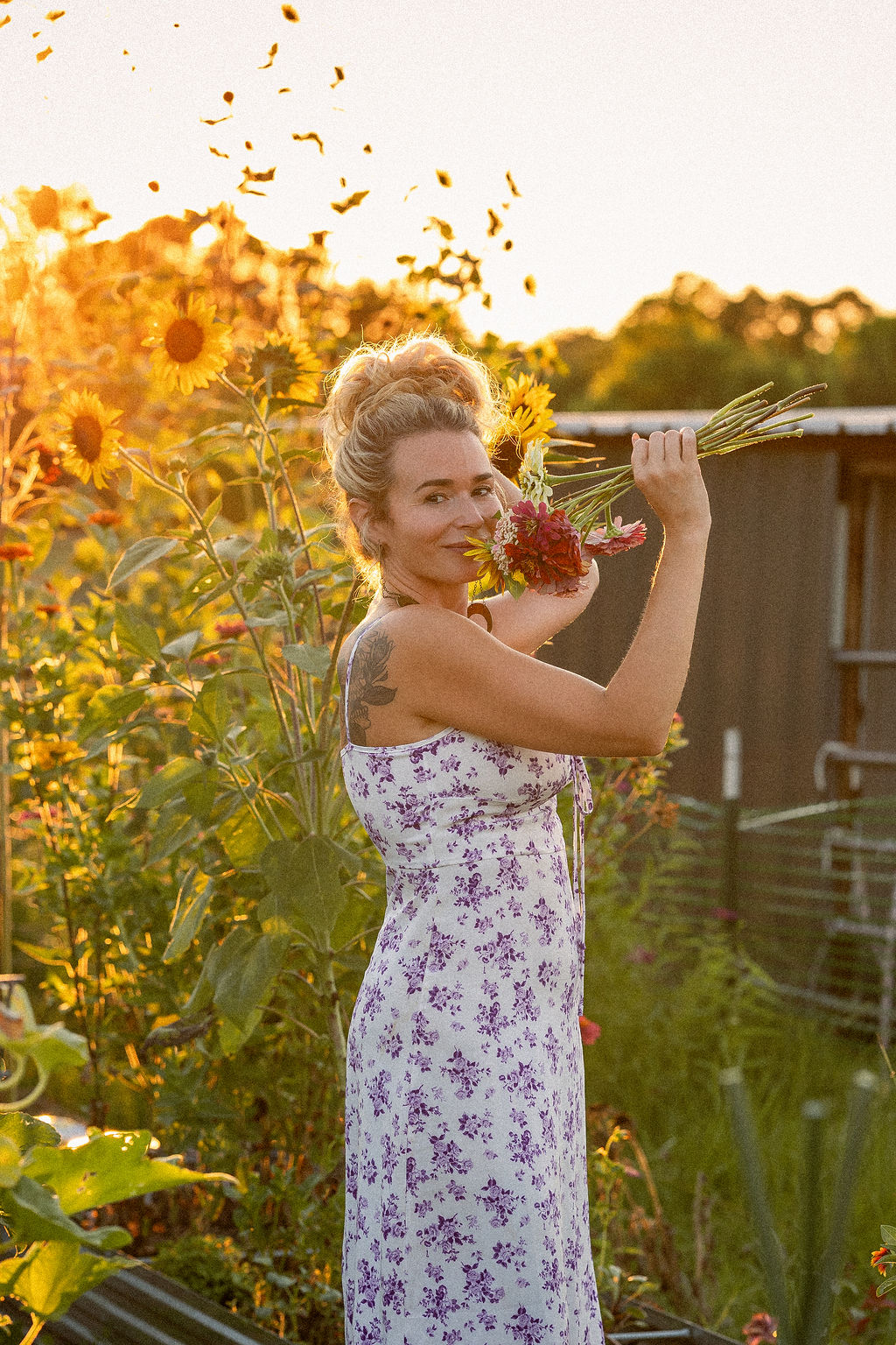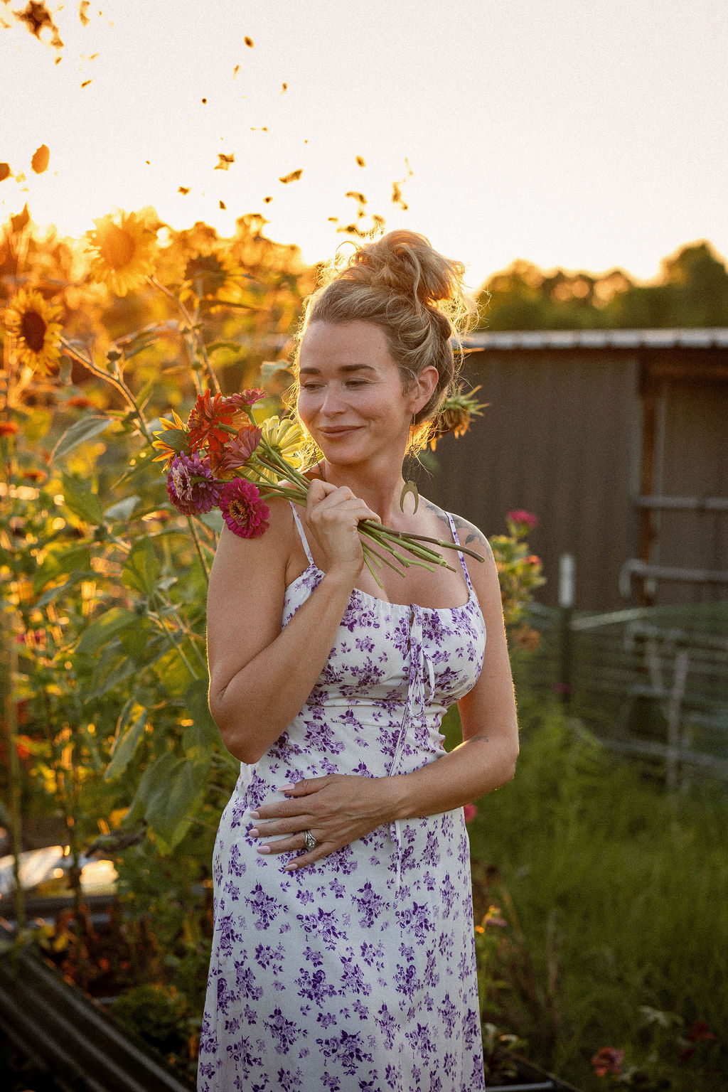 As we picked flowers and vegetables, the sun began to set in the distance. Of course, Mama cow couldn’t resist sneaking a bite of the flowers we gathered, but we laughed and let it be part of the story. It was the perfect representation of how unscripted moments create the most meaningful images.